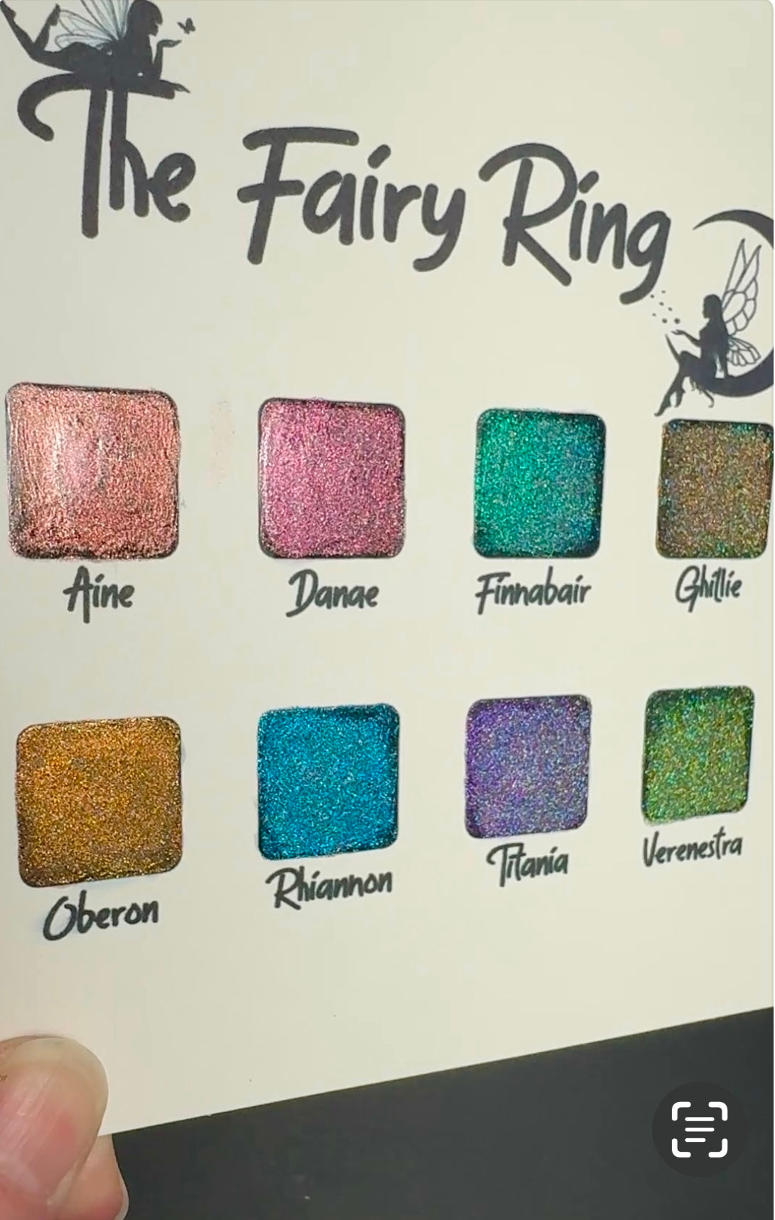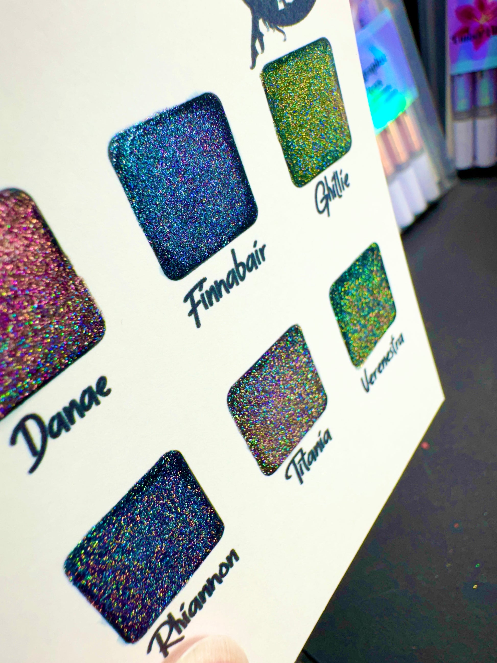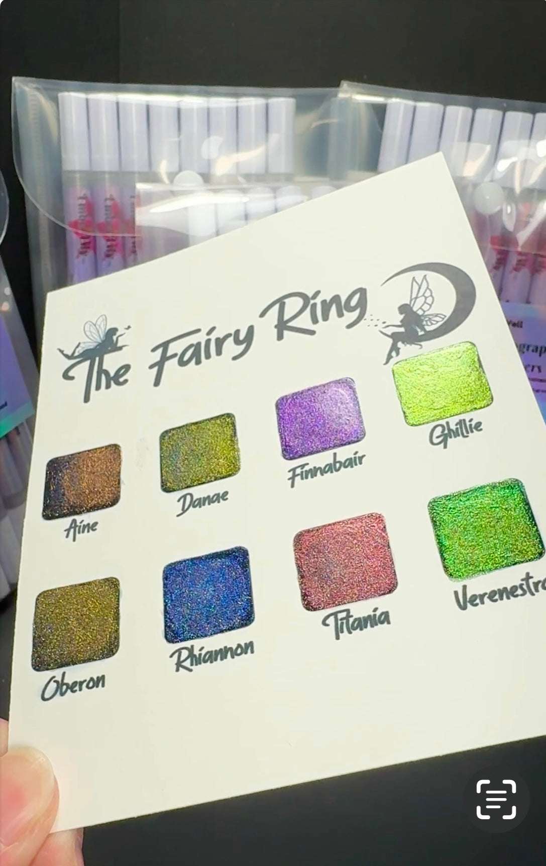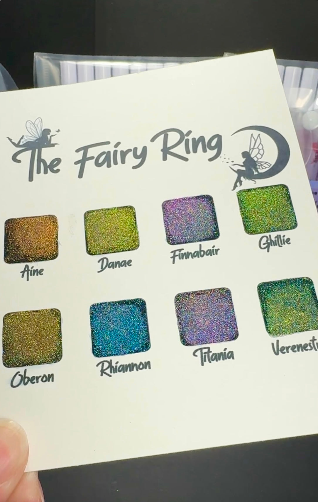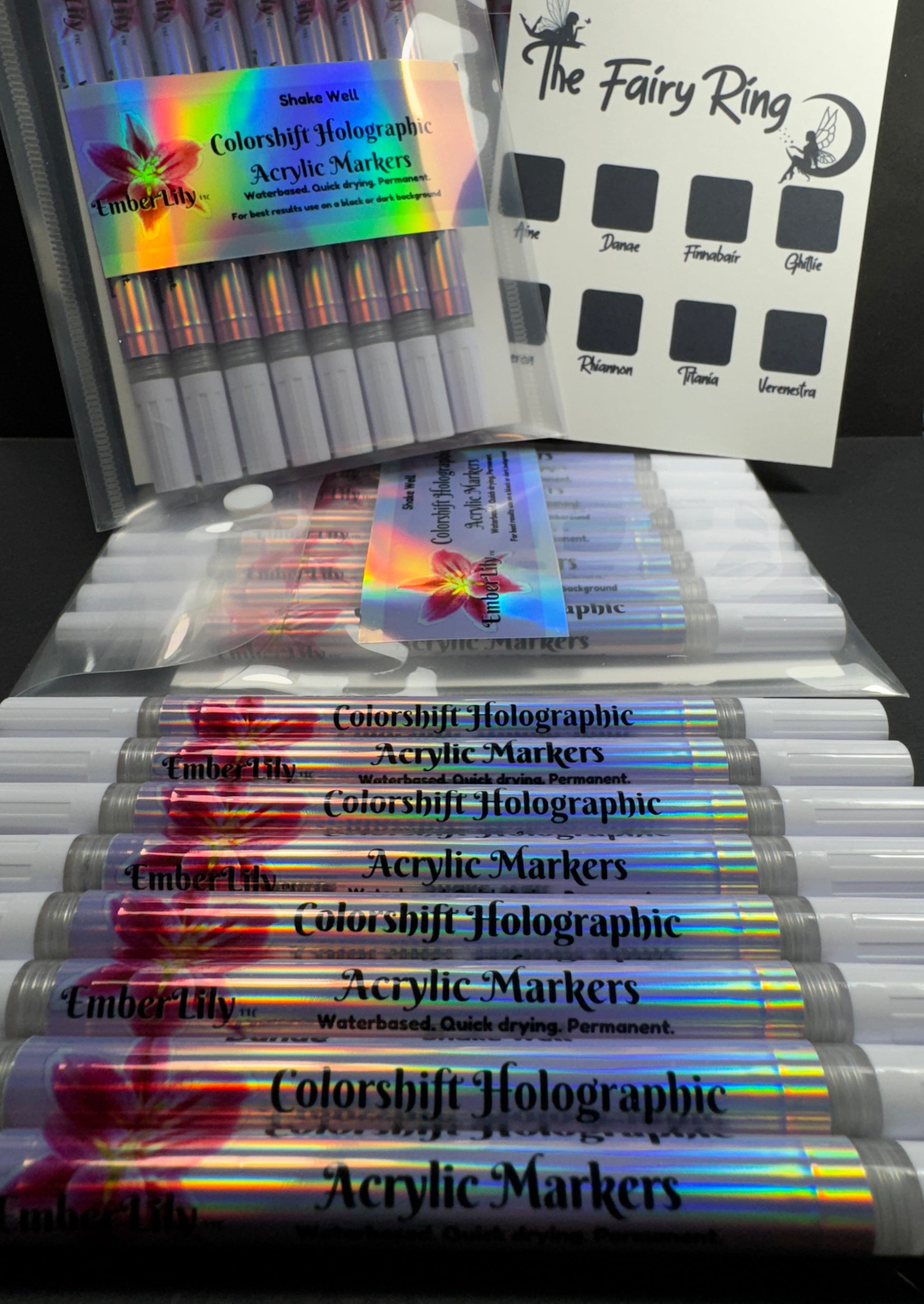 Colorshift Holographics in this set are from The Fairy Ring series: The Fairy Ring Vivid Holographic Hyper-shifting Chrome Colorshift Acrylic Paint Markers- Set of 8 prismatic supershift chameleon metallic holographic acrylic paints.