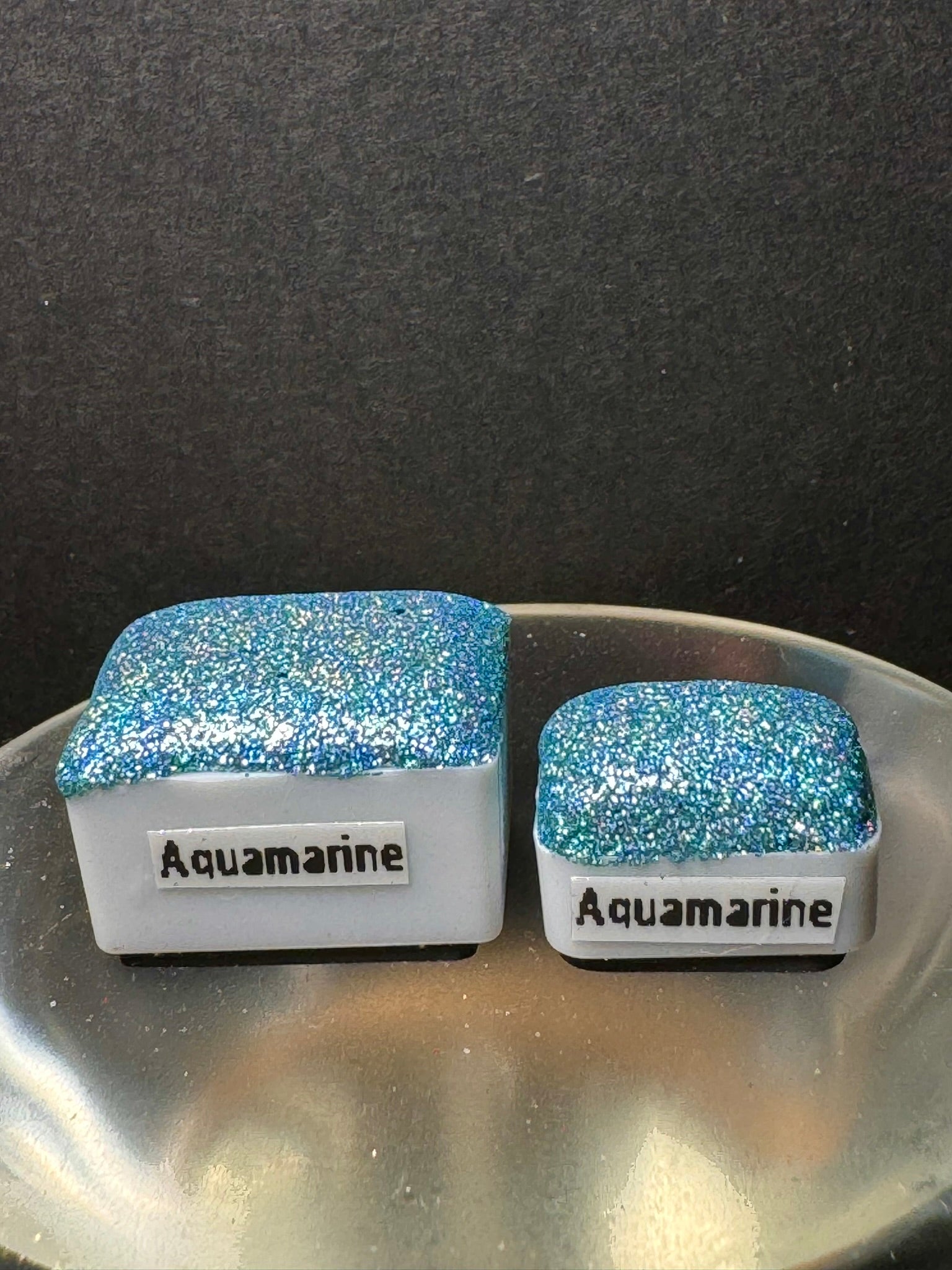 A serene, pale blue pigment with shimmering holographic flecks that reflect in shades of turquoise, icy silver, and soft seafoam green. The cool, crystalline blue base captures the tranquil beauty of aquamarine, evoking the clarity and depth of ocean waters. The holographic sparkles enhance its ethereal quality, creating a radiant, watery shimmer that mimics the gemstone’s luminous, calming essence under sunlight.
