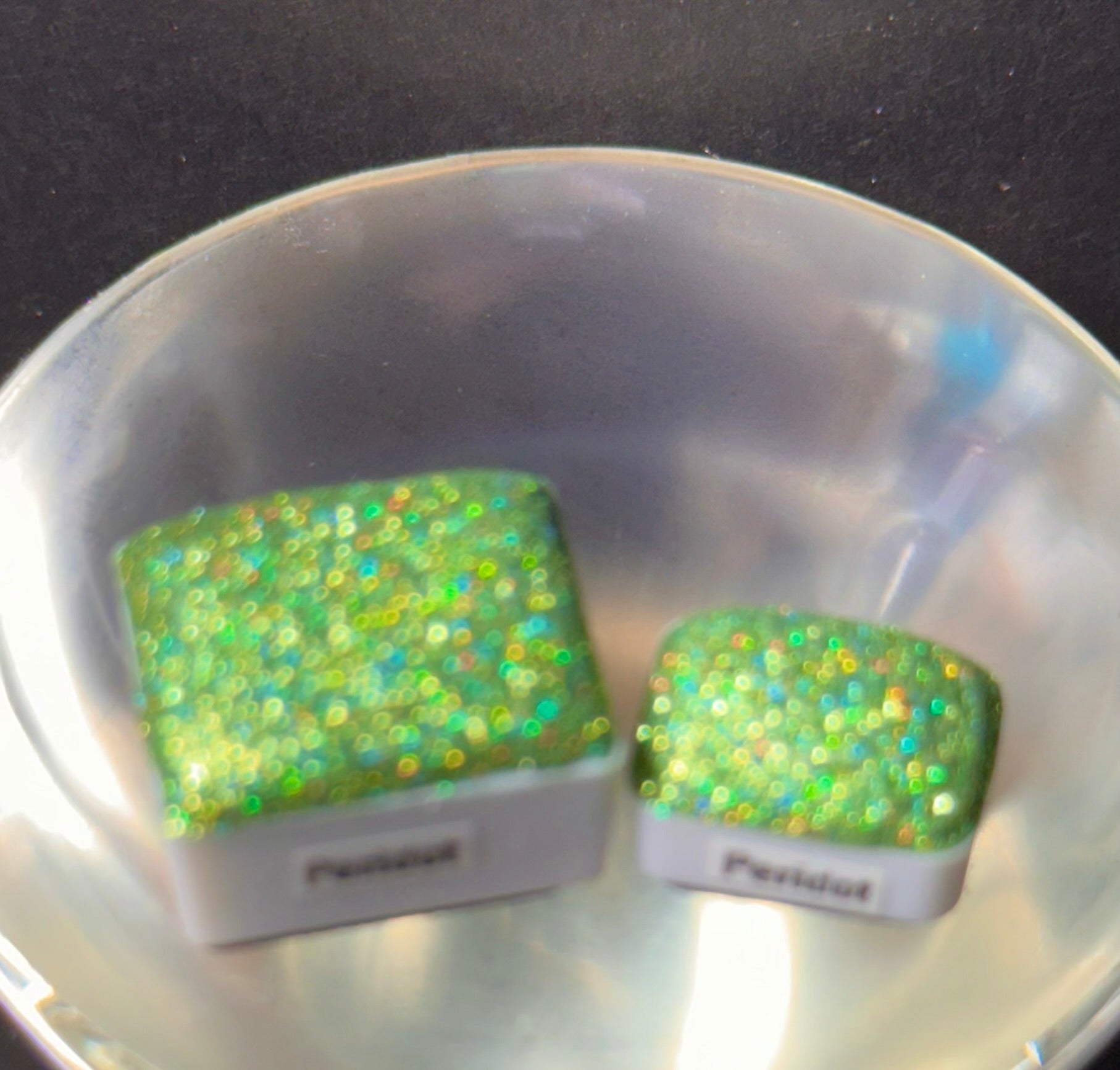 A bright, lime-green pigment infused with holographic sparkles in gold, chartreuse, and emerald. The color dances with vibrant energy, reflecting the lively and youthful appearance of the peridot gemstone.