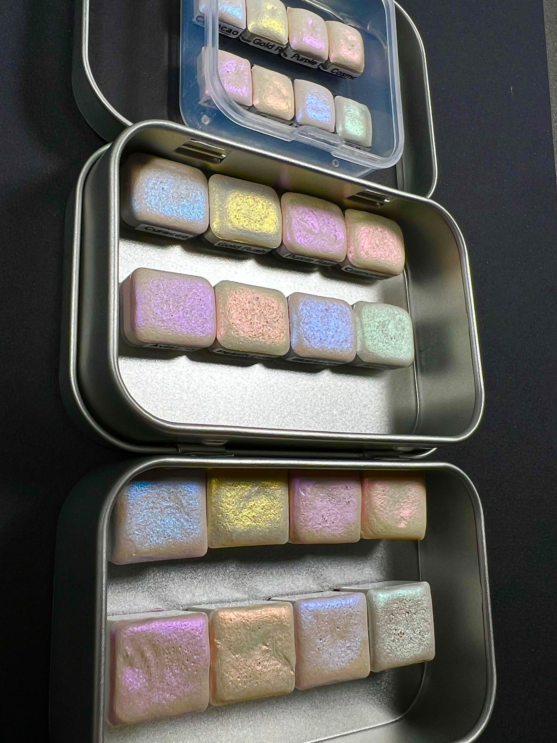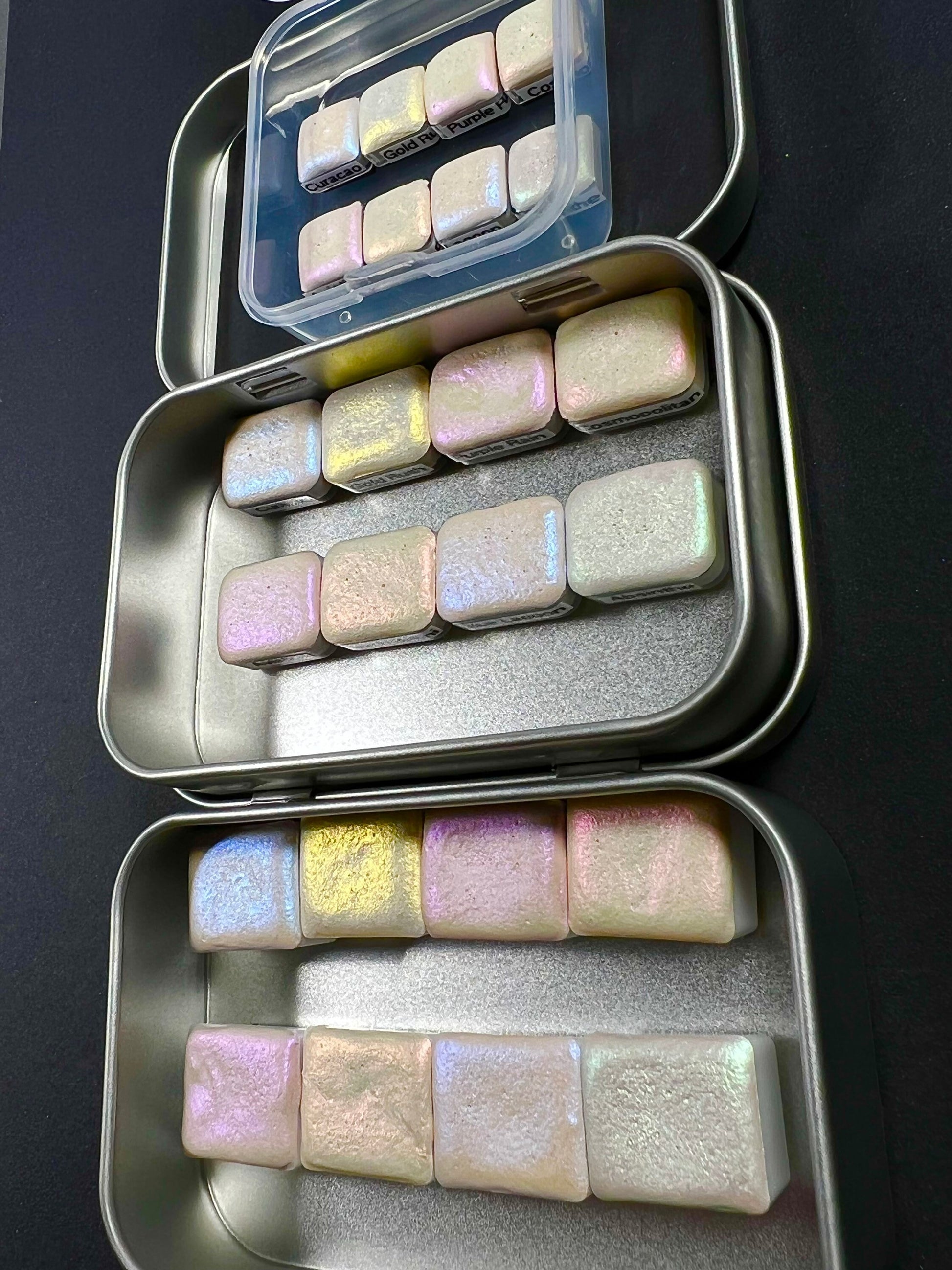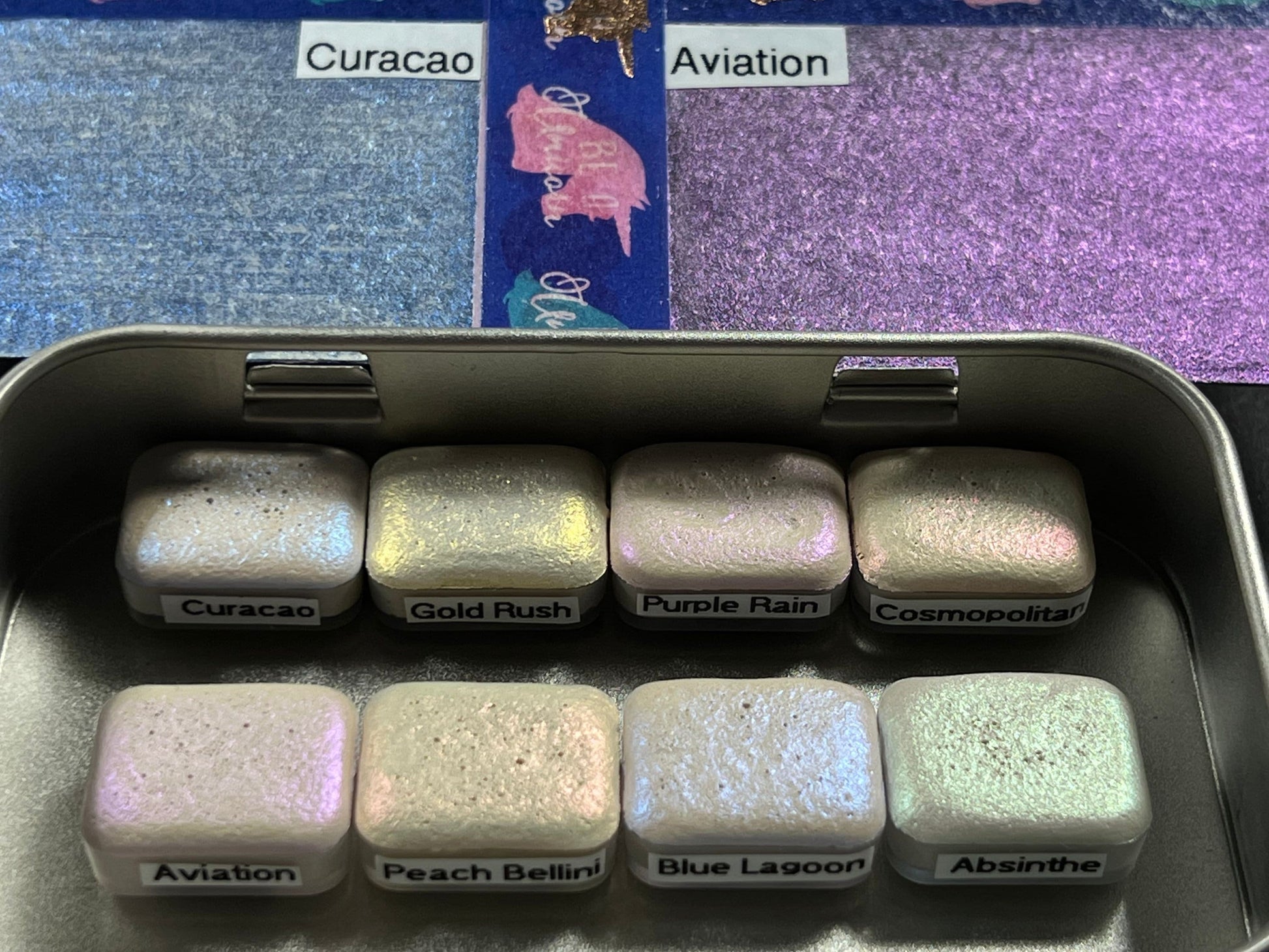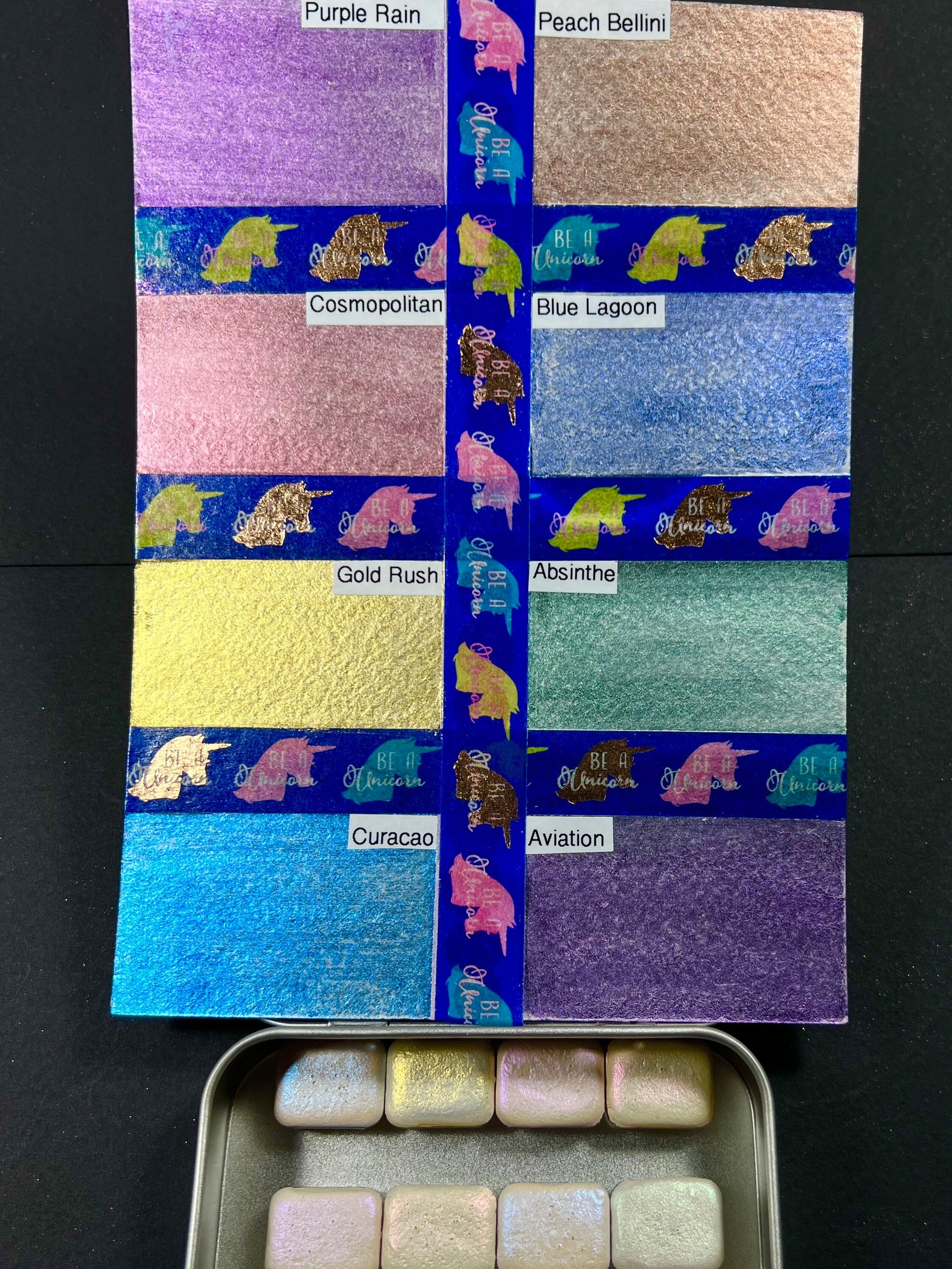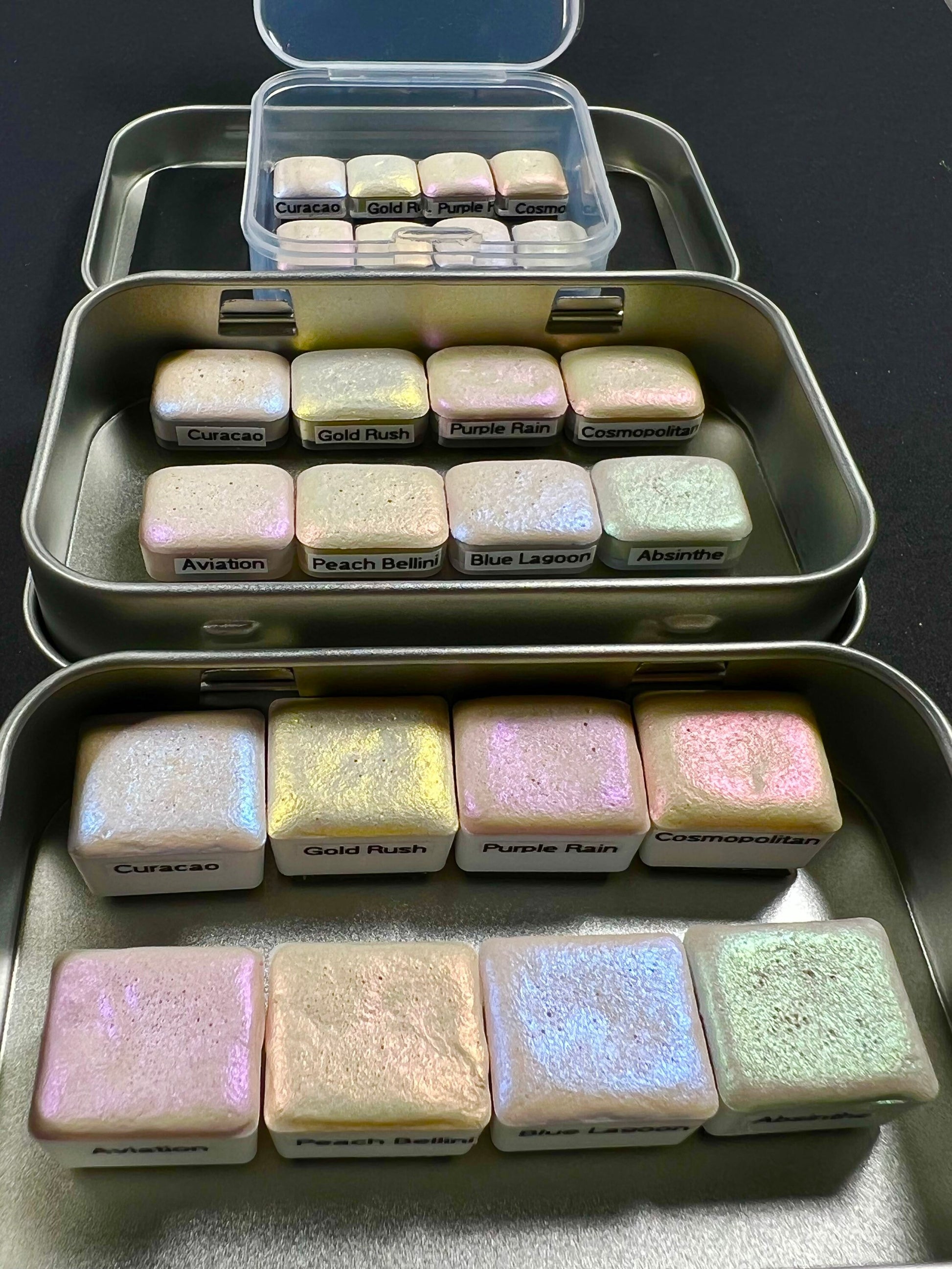 LIMITED EDITION Cocktail Set includes 8 iridescent shimmer colorshift watercolors in half pans, quarter pans…or if you are wanting a smaller sample, get the mini pans set.