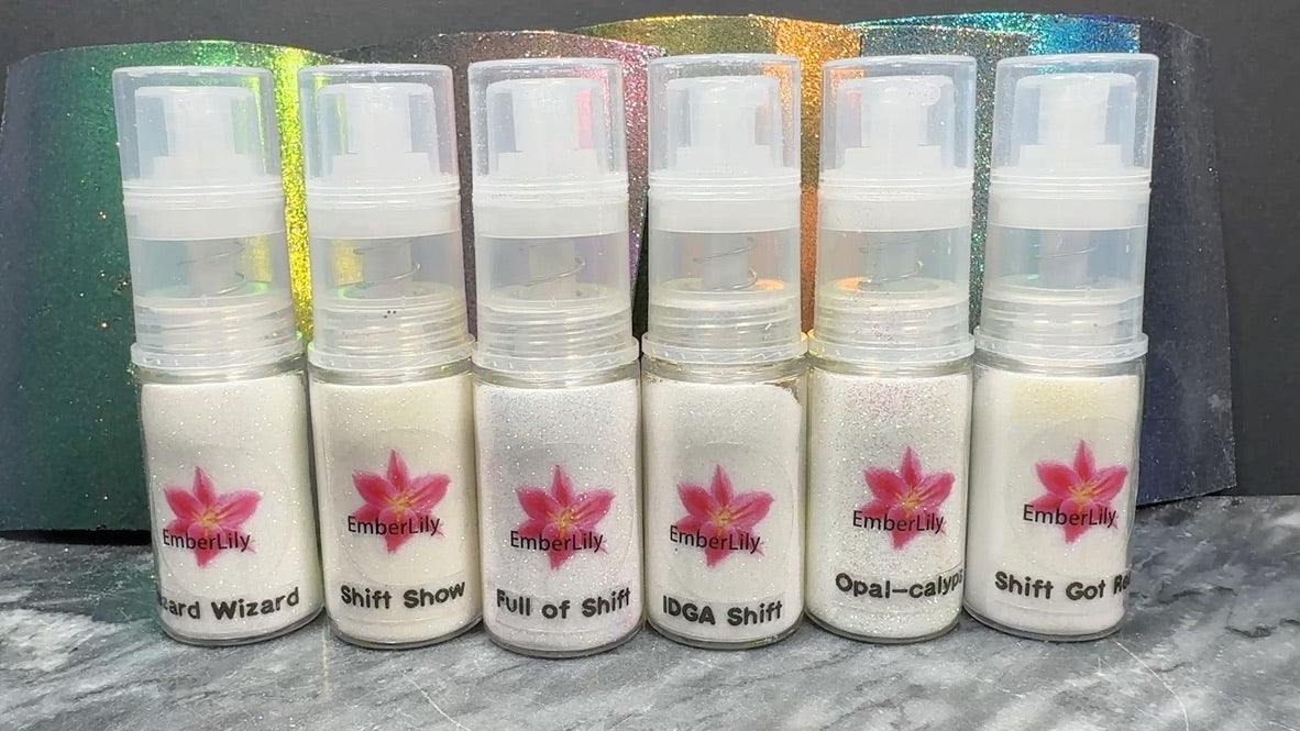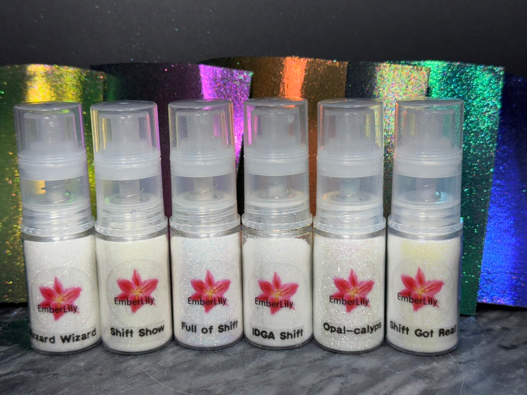 Each set has 6 different ghost colorshift microfine glitters - approx 5-7 grams of each glitter in a glitter sprayer. These glitters are so fine that they are more like pigment powders!