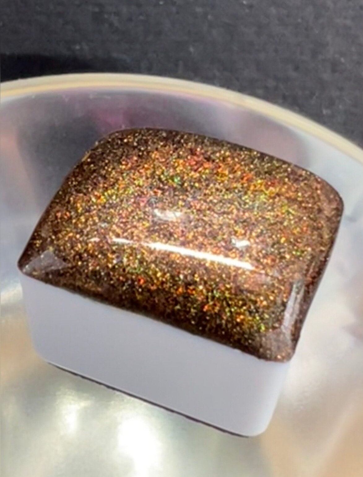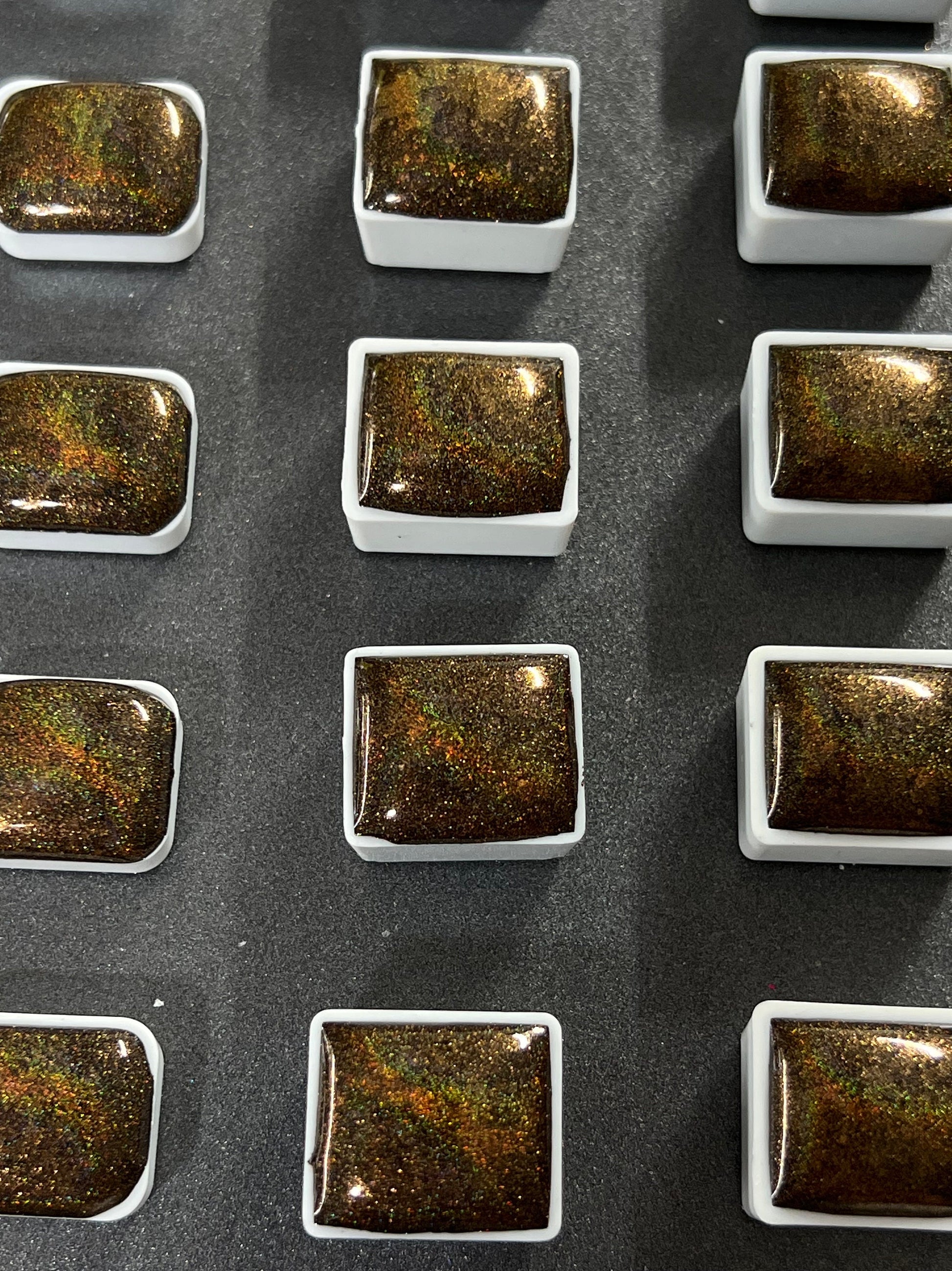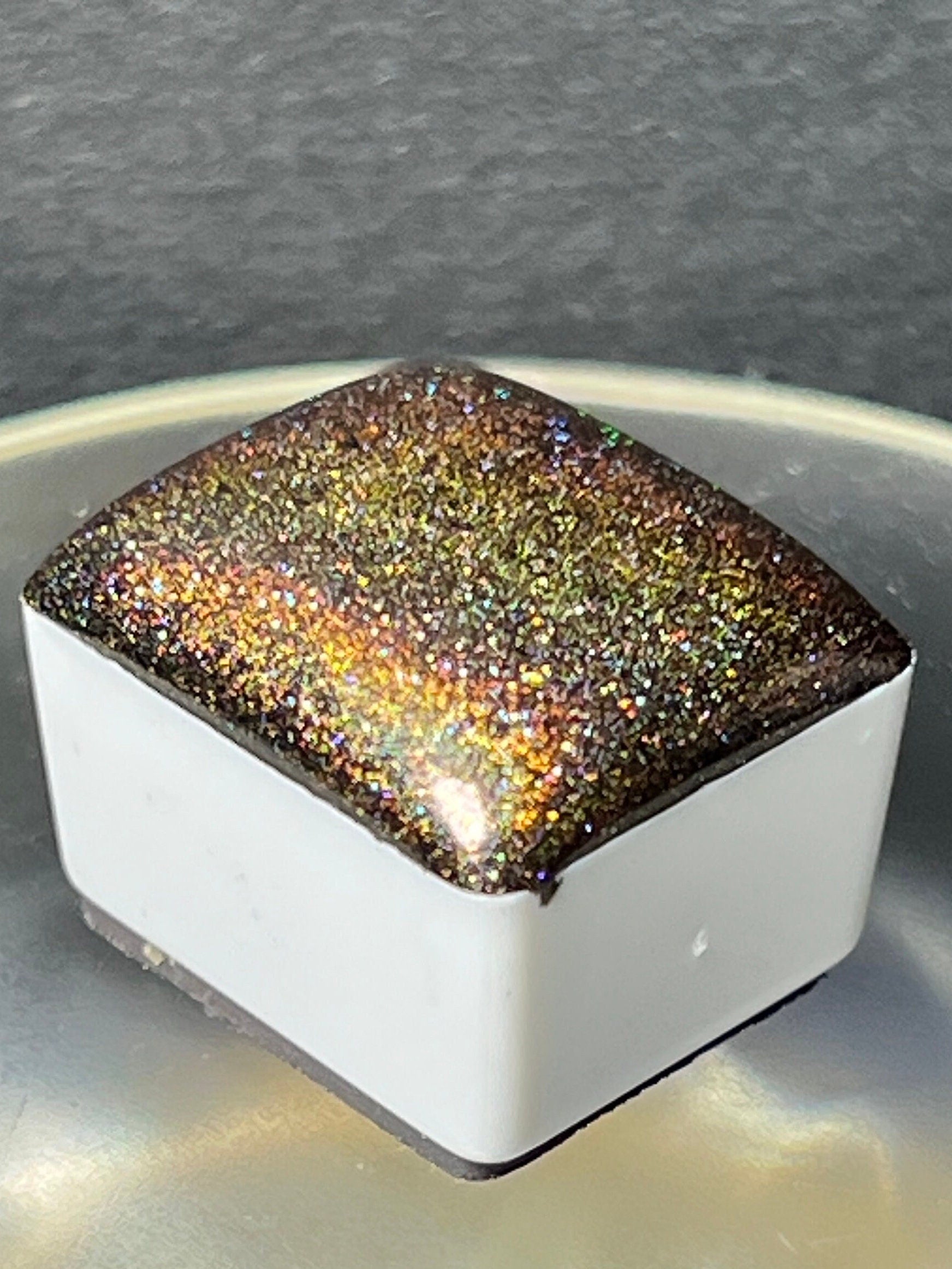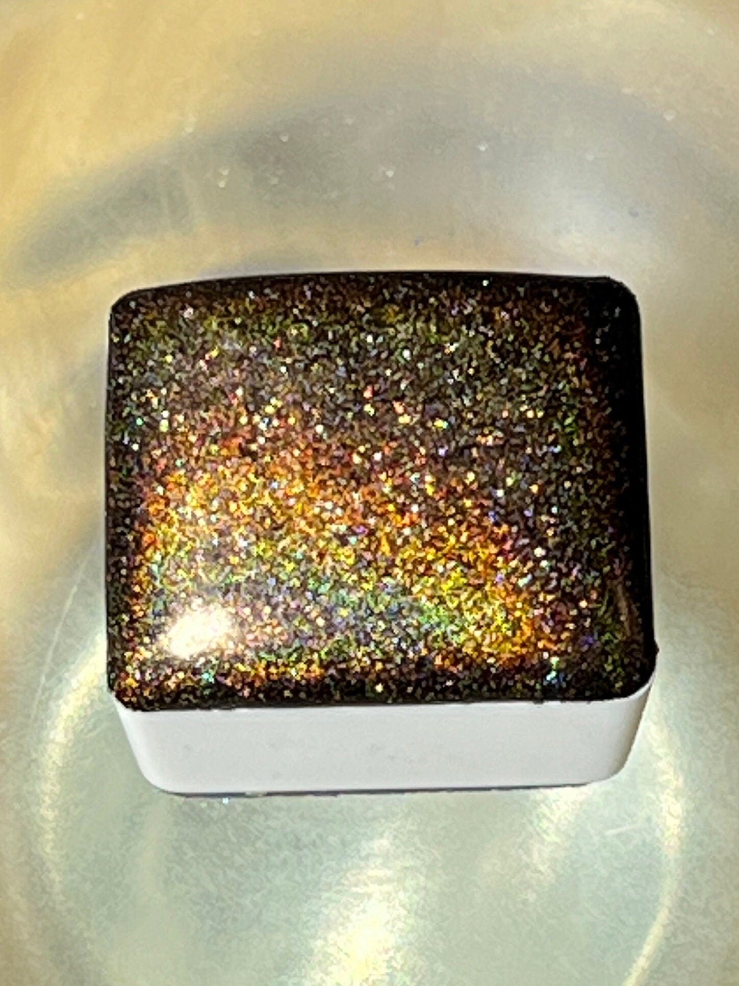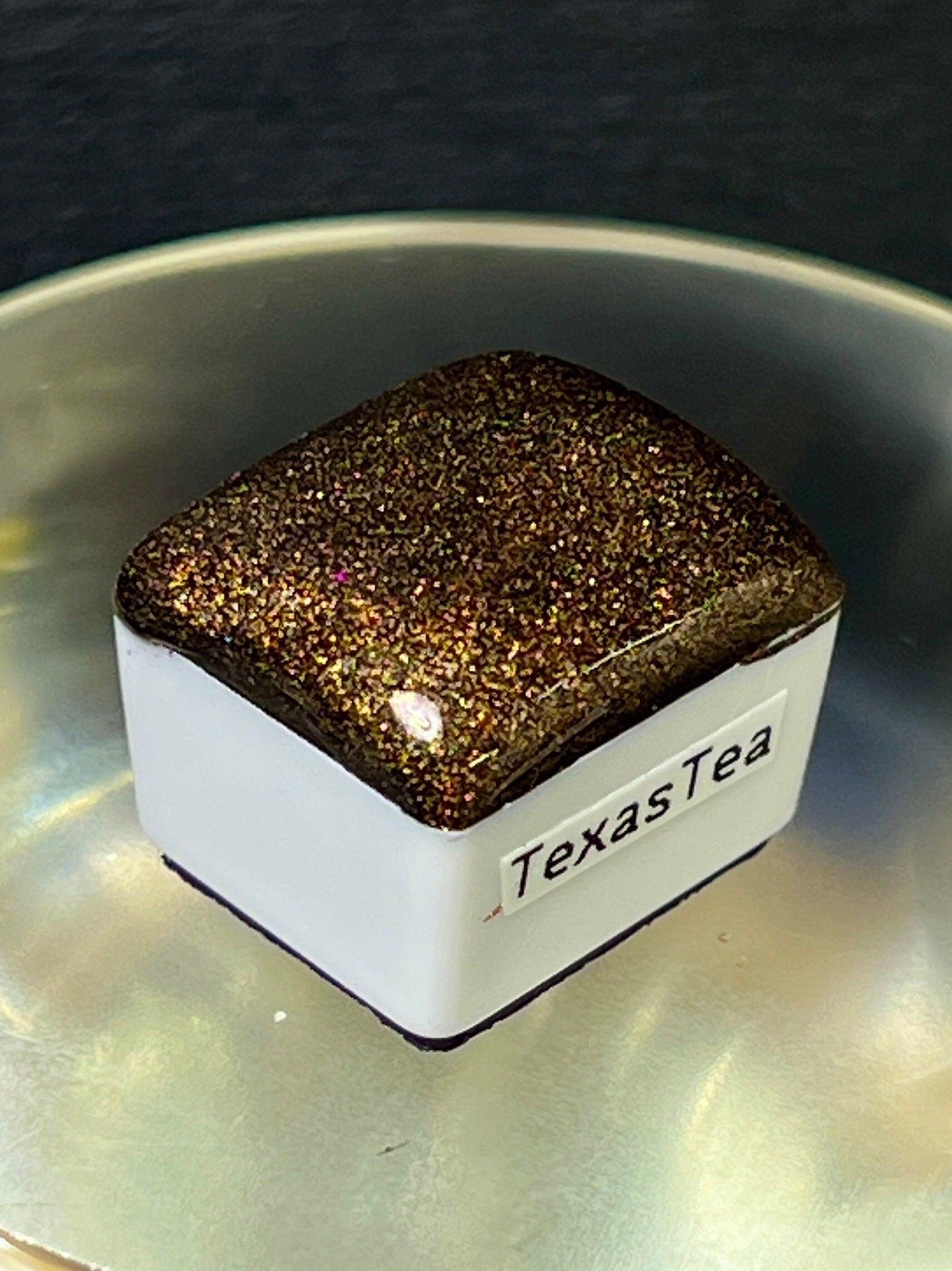 Texas Tea is a stunning watercolor paint that combines a gold holographic pigment with a black laser chrome pigment. When applied to paper, it creates a mesmerizing effect as the gold holographic particles catch and reflect the light, giving your artwork a dynamic and shimmering quality. The black laser chrome pigment adds depth and contrast, creating a striking visual composition that's reminiscent of the rich and bold colors often associated with luxury. This unique combination of pigments gives "Texas Tea" a truly captivating and distinctive appearance, making it an excellent choice for adding a touch of magic to your watercolor creations. Very complimentary to Fairy Dust or any of the other Chrome watercolors or colorshift watercolors available in my store.